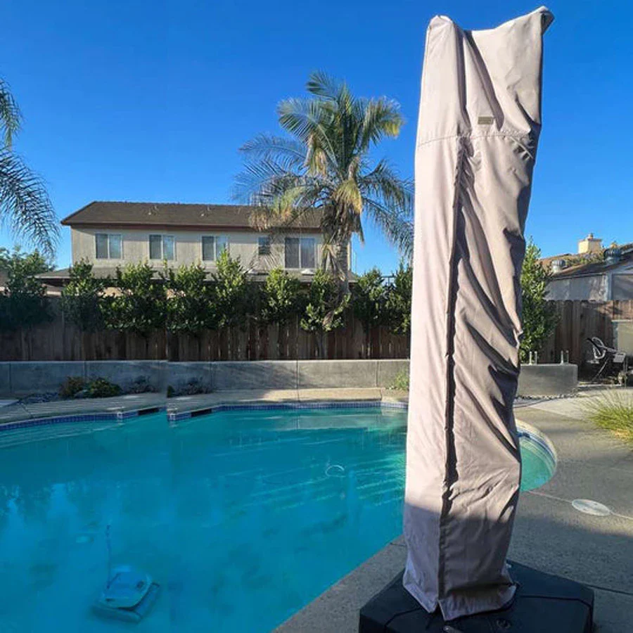 - Advantages: Each parasol cover is equipped with a telescopic pole, convenient to lift the umbrella cover up & off without a ladder. A adjustable long rope attached to the zipper head for easy zipping and unzipping.